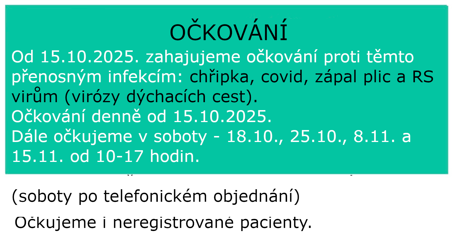 Od 15.10.2025 zahajujeme očkování proti těmto přenosným infekcím: chřipka, covid, zápal plic a RS virům (virózy dýchacích cest). Očkování denně od 15.10.2025. Dále očkujeme v soboty - 18.10., 25.10., 8.11. a 15.11. od 10-17 hodin (soboty po telefonickém objednání)